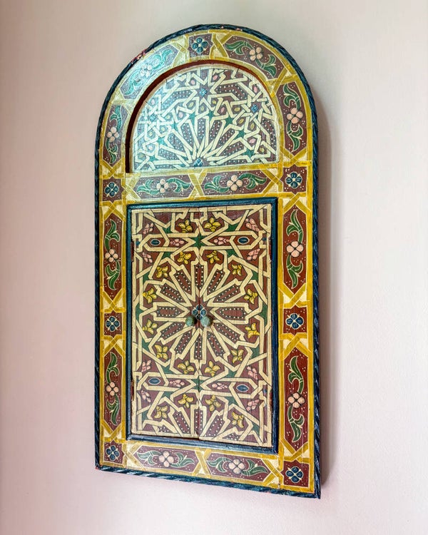 Breng een oosters sfeertje in huis met deze prachtige Marokkaanse spiegellijst! 🧡 De lijst is verfijnd afgewerkt met handgeschilderde, traditionele patronen – een schitterend staaltje vakmanschap om van te genieten. 🌟 En die schattige deurtjes? Die kun je gewoon openen en sluiten, hoe leuk is dat? 😊