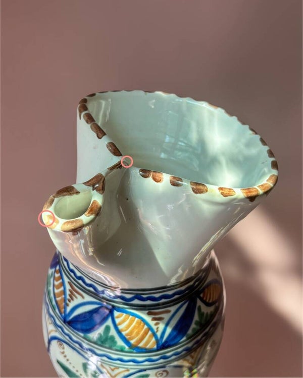 Dit item verkeert in goede staat, maar heeft wel wat imperfecties, zoals dat de glazuurlaag op een aantal plekjes dun of niet aanwezig is (zie foto 4 en 5). Dit is eenmaal passend voor handgemaakte producten en voegt wat ons betreft extra charme toe aan dit item! 🫶🏾